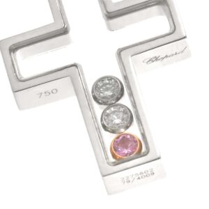 今回お譲りいただいたお品物は、Chopardを代表するハッピーダイヤシリーズのネックレスであり、サファイヤとダイヤモンドが可憐に揺れるデザインが非常に印象的でした。K18WGとPGのコンビ素材による柔らかな色味のバランスも魅力的で、ジュエリーとしての完成度の高さが際立っています。こうしたブランドジュエリーは、ショパールの婚約指輪を検討される方からも注目されることが多く、ブランド全体の評価や人気が査定に影響を与える傾向にあります。