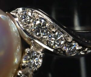 今回お持ちいただいたリングは、Pt900の地金に天然パールと小粒ながら輝きの美しいダイヤモンドがあしらわれたジュエリーです。パールの柔らかな光沢と、ダイヤモンドの煌めきが絶妙に調和しており、上品で華やかな印象を与えます。リング全体のデザインバランスや石の配置も丁寧に設計されており、日常使いからフォーマルまで幅広く活躍する逸品です。