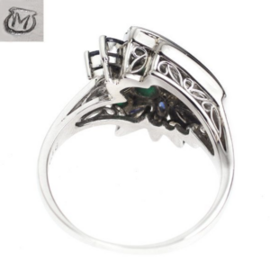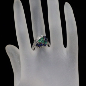 このたびは大切なジュエリーをお任せいただき、ありがとうございました。リングを拝見した瞬間にまず伝わってきたのは、ミキモトらしい端正さと、色石を上品にまとめる設計の巧さです。中心のエメラルドは0.37ctと控えめなサイズ感ながら、周囲に配されたサファイア0.85ctとダイヤモンド0.46ctが光の層をつくり、石の表情に奥行きを与えていました。色石とダイヤの配置は、単に華やかに見せるだけでなく、実際の流通でも評価が安定しやすい組み合わせです。