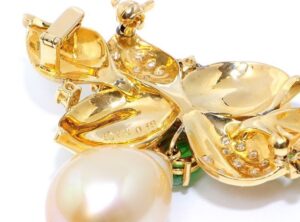 今回お預かりしたブローチはタサキ製で、K18素材にエメラルドがあしらわれた繊細なデザインでした。査定ではまず、エメラルドの鑑定がどのように行われるかという視点から、色味、透明度、内包物、ジュエリーとしての完成度を丁寧に確認しました。エメラルドはその独特の緑色が魅力ですが、色味の違いによって評価が大きく変わりますので、エメラルドの鑑定は重要なポイントです。