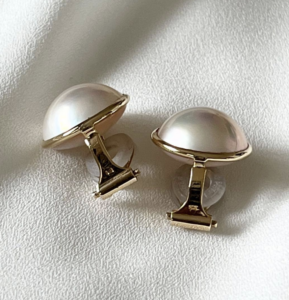 マベパール 価値は、まず真珠そのものの照りや色味、表面のなめらかさによって大きく左右されます。マベパール 価値 色という言葉が気になる方もいらっしゃいますが、実際には単純に色が濃いか薄いかではなく、光を受けたときに自然でやわらかな光沢が出るか、面全体に品のある表情があるかが重要です。マベパールは半球状で面が広く見えるため、小さな表面変化や光沢の差も印象に出やすい素材です。そのぶん、状態が良く、左右で照りや色味がきれいにそろっているお品は、マベパール 価値をしっかり評価しやすくなります。今回のお品も、イヤリングとして身につけたときの見映えが想像しやすく、全体の印象がまとまっていました。