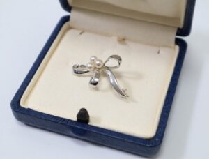 今回お預かりしたリボンモチーフ ブローチは、ミキモトならではの優雅なデザインで、真珠をアクセントにした上品なジュエリーでした。素材にはS刻印のシルバーが使われており、総重量3.69gと軽やかな装着感ながら、ブランドとしての存在感がしっかりと感じられるお品物でした。こうしたお品を拝見しながら、ミキモトの買取評価を丁寧に進めることができたのは、大変嬉しいことです。
