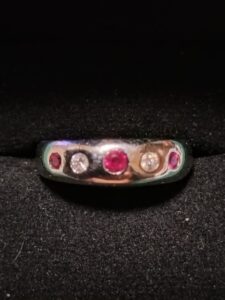 このたびは大切なお品物をお任せいただき、心より感謝申し上げます。今回お預かりしたリングは、深みのあるルビーとダイヤモンドが組み合わされた華やかなデザインで、Pt850の落ち着いた輝きが全体を引き締める上品な印象のお品でした。やや傷や汚れが見受けられる状態ではありましたが、石の色味やバランス、地金としての価値を総合的に評価させていただきました。