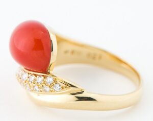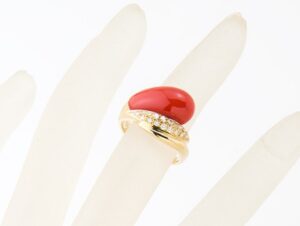 また、リングにはダイヤモンドも使用されており、珊瑚の落ち着いた色合いに輝きを添えるデザインとなっていました。ダイヤモンドは小粒のメレダイヤであってもジュエリー全体の印象を引き立てる重要な要素となるため、石留めの状態や輝きなどを確認しながら査定を行っています。石の配置やデザインのバランスなども含めて総合的に評価いたしました。