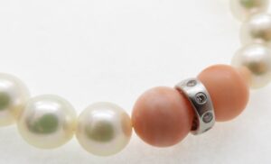 今回お持ち込みいただいたネックレスは、珊瑚・パール・ダイヤモンドを組み合わせた華やかなデザインのジュエリーでした。天然珊瑚の鮮やかな色合いと、パールの柔らかな光沢、さらにダイヤモンドの輝きがバランスよく配置されており、高級感のある仕上がりのお品物でした。こうした複数の宝石を組み合わせたジュエリーはデザイン性が高く、中古市場でも一定の人気があります。