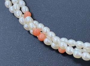 今回の3連パールネックレスに使われている珊瑚は、色味や艶が比較的均一で、ピンク珊瑚の見分け方としてチェックした自然な色合いと表面の艶が整っている点が評価につながりました。ピンク珊瑚は一般的に柔らかなピンク色が好まれ、ピンク珊瑊ネックレスの値段として安定した評価が出る傾向がありますが、色のムラや曇りがある場合は評価が下がることがあります。査定では光を当てながら色味の濃淡を確認し、天然由来の光沢があるかどうかを丁寧に確認しました。
