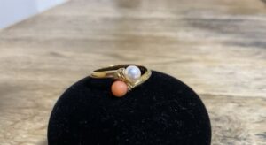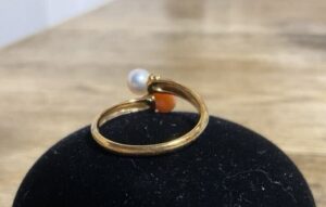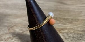 今回お持ち込みいただいたリングは、パールと珊瑚が組み合わされたデザインが特徴的なジュエリーでした。パールのやわらかな光沢と珊瑚の優しい色合いが調和しており、上品な印象を与えるリングとなっています。こうした異なる宝石を組み合わせたジュエリーはデザイン性が高く、ファッションジュエリーとしても人気があります。