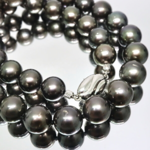 南洋真珠の価値を決めるうえで、最初に見るのは真珠そのものの美しさです。南洋黒蝶真珠は、黒一色に見えても実際にはグリーン系やグレー系など微妙な色の差があり、照りの強さによって印象が大きく変わります。ネックレスでは一粒ごとの美しさだけでなく、全体の色味がそろっているか、着用時に自然な流れが出るかが重要です。南洋真珠 ネックレスとして見たときに、珠のサイズ感や色の並びに違和感が少ないものは評価しやすくなります。南洋真珠の価値を考える際、単に大きい珠が並んでいるだけでなく、一本として完成度があるかどうかが大切です。