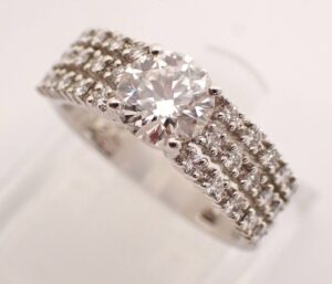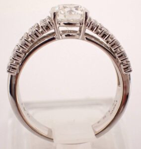プラチナリングの相場を左右する大きな要素が、ダイヤモンドの品質です。今回のリングでは、メインダイヤ1.24ctに加え、周囲のメレダイヤ0.41ctが全体の印象を高めています。4Cの中でも透明度とカットのバランスが良く、光をしっかり反射する点が評価につながりました。プラチナダイヤ指輪の買取価格は、石の個性が相場に反映されやすいのが特徴です。