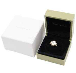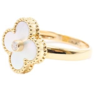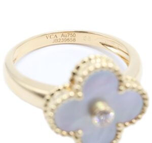 今回お預かりしたリングは、ヴァンクリーフ製の美しいマザーオブパールをあしらったデザインで、750YGの素材感とダイヤモンドの輝きが上品に調和したジュエリーでした。箱付きで保存状態も良好であり、査定時にその状態の良さがお客様にとっても安心材料となりました。査定では特にヴァンクリーフの買取評価を中心に進めさせていただきました。
